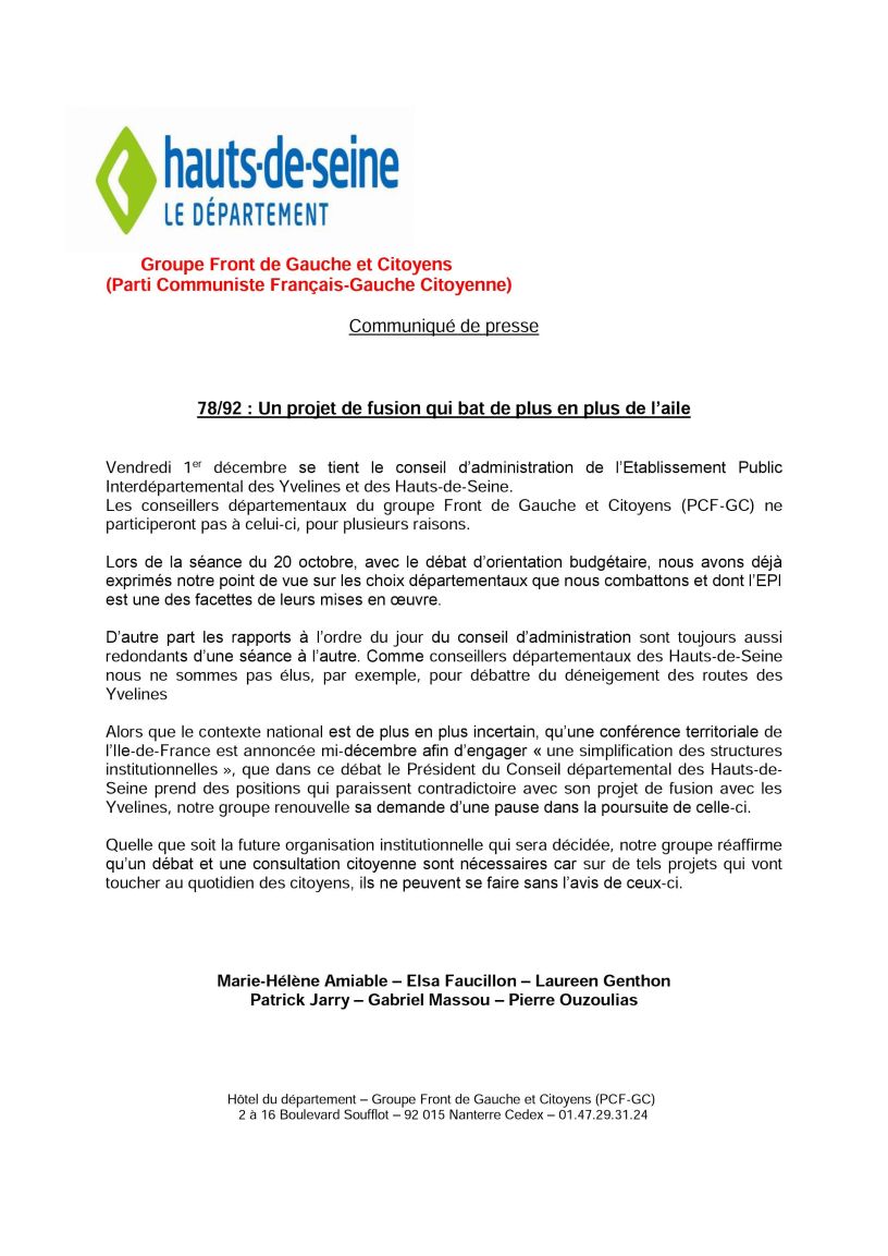 Communiqués de presse, La fusion du 78-92 Les conseillers départementaux du groupe ne seront pas présents au Conseil d’Administration de l’EPI 78/92 du 1er décembre 2017 – leur communiqué de presse. Date: 30 novembre 2017Author: GroupeGCCR92 0 Commentaires 7 Partager : Cliquer pour partager sur X(ouvre dans une nouvelle fenêtre) X Cliquez pour partager sur Facebook(ouvre dans une nouvelle fenêtre) Facebook J’aime chargement… Articles similaires