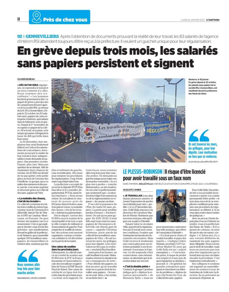 Mobilisés pour la défense des droits des salariés sans-papiers de l’agence d’interim RSI – Article du Parisien – 24 janvier 2022