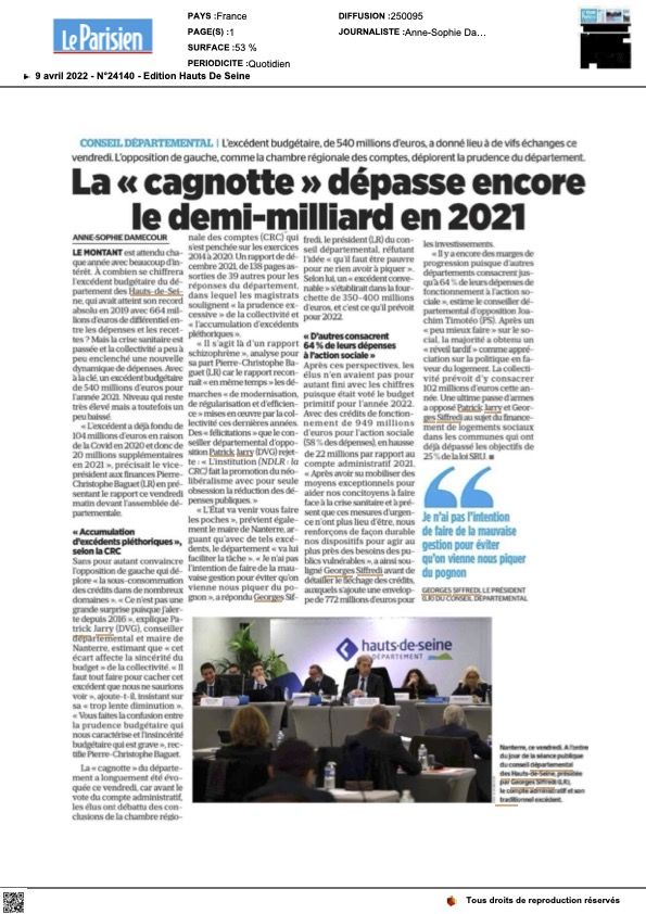 Le montant est attendu chaque année avec beaucoup d’intérêt. À combien se chiffrera l’excédent budgétaire du département des Hauts-de-Seine, qui avait atteint son record absolu en 2019 avec 664 millions d’euros de différentiel entre les dépenses et les recettes ? Mais la crise sanitaire est passée et la collectivité a peu à peu enclenché une nouvelle dynamique de dépenses. Avec à la clé, un excédent budgétaire de 540 millions d’euros pour l’année 2021. Niveau qui reste très élevé mais a toutefois un peu baissé.