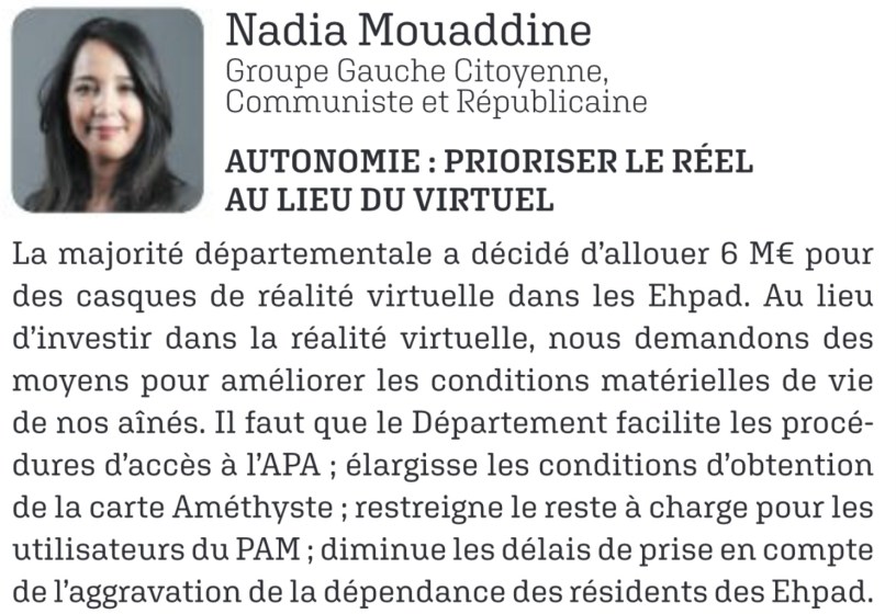 La majorité départementale a décidé d’allouer 6 M€ pour des casques de réalité virtuelle dans les Ehpad. Au lieu d’investir dans la réalité virtuelle, nous demandons des moyens pour améliorer les conditions matérielles de vie de nos aînés. Il faut que le Département facilite les procédures d’accès à l’APA ; élargisse les conditions d’obtention de la carte Améthyste ; restreigne le reste à charge pour les utilisateurs du PAM ; diminue les délais de prise en compte de l’aggravation de la dépendance des résidents des Ehpad.