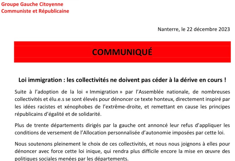 C’est pourquoi, lors de la séance publique du Conseil départemental des Hauts-de-Seine d’aujourd’hui, nous avons demandé au président Georges Siffredi et à sa majorité de ne pas céder à la dérive en cours, et que notre Département se déclare lui aussi officiellement contre cette loi immigration, en affirmant son refus d’appliquer les nouvelles conditions de versement de l’APA.