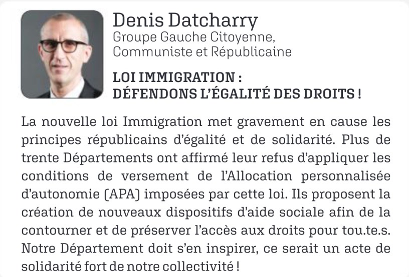 La nouvelle loi Immigration met gravement en cause les principes républicains d’égalité et de solidarité. Plus de trente départements ont affirmé leur refus d’appliquer les conditions de versement de l’Allocation personnalisée d’autonomie (APA) imposées par cette loi. Ils proposent la création de nouveaux dispositifs d’aide sociale afin de la contourner et de préserver l’accès aux droits pour tou.te.s. Notre Département doit s’en inspirer, ce serait un acte de solidarité fort de notre collectivité !