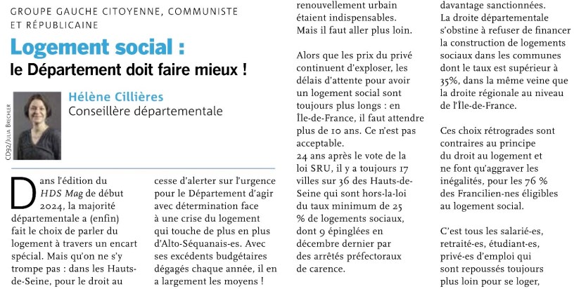 Dans l’édition du HDS Mag de début 2024, la majorité départementale a (enfin) fait le choix de parler du logement à travers un encart spécial. Mais qu’on ne s’y trompe pas : dans les Hauts-de-Seine, pour le droit au logement, le compte n’y est pas !