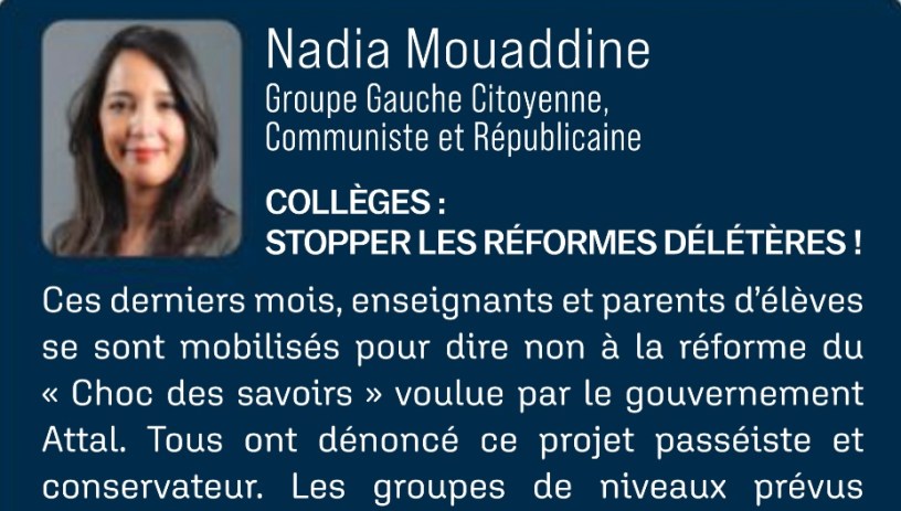 Tribune de Nadia Mouaddine – Lettre Bleue des Hauts-de-Seine, septembre 2024 : « Collèges : stopper les réformes délétères ! »