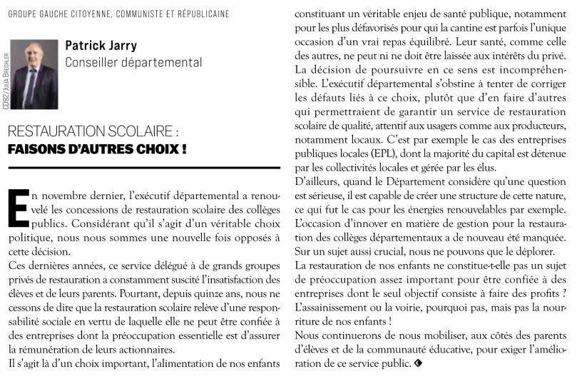En novembre dernier, l’exécutif départemental a renouvelé les concessions de restauration scolaire des collèges publics. Considérant qu’il s’agit d’un véritable choix politique, nous nous sommes une nouvelle fois opposés à cette décision.