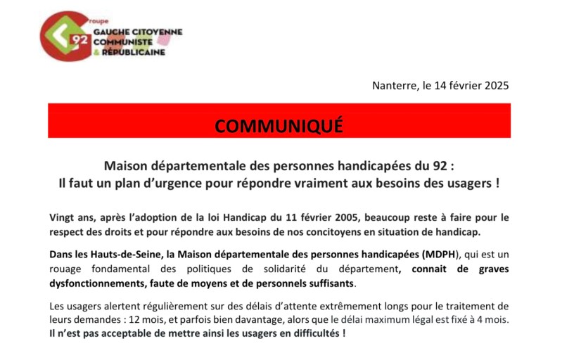 Dans les Hauts-de-Seine, la Maison départementale des personnes handicapées (MDPH), qui est un rouage fondamental des politiques de solidarité du département, connait de graves dysfonctionnements, faute de moyens et de personnels suffisants.