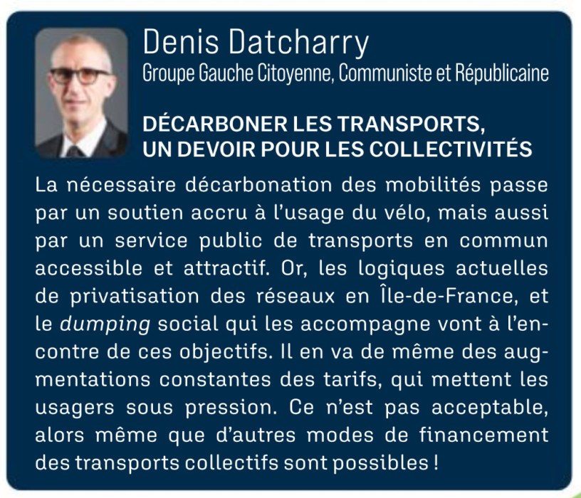 La nécessaire décarbonation des mobilités passe par un soutien accru à l’usage du vélo, mais aussi par un service public de transports en commun accessible et attractif. Or les logiques actuelles de privatisation des réseaux en Ile-de-France, et le dumping social qui les accompagne vont à l’encontre de ces objectifs. Il en va de même des augmentations constantes des tarifs, qui mettent les usagers sous pression. Ce n’est pas acceptable, alors même que d’autres modes de financement des transports collectifs sont possibles !