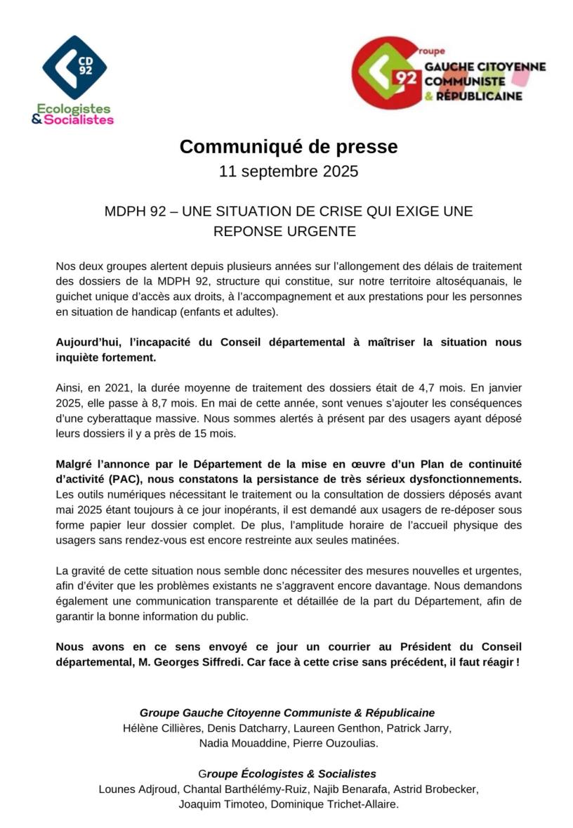 Communiqué conjoint avec le groupe Ecologistes & Socialistes : MDPH 92 – UNE SITUATION DE CRISE QUI EXIGE UNE REPONSE URGENTE