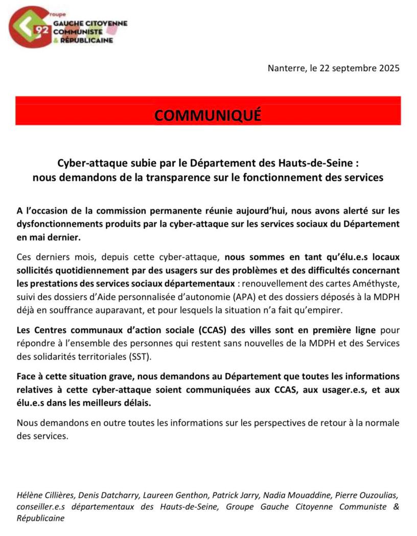 Face à cette situation grave, nous demandons au Département que toutes les informations relatives à cette cyber-attaque soient communiquées aux CCAS, aux usager.e.s, et aux élu.e.s dans les meilleurs délais.